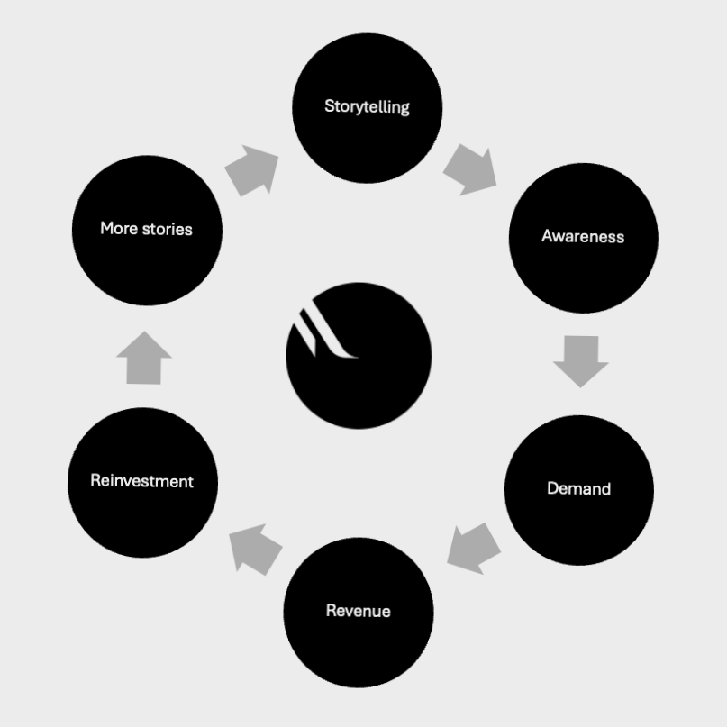 Storytelling → Awareness → Demand → Revenue → Reinvestment → More stories to tell →